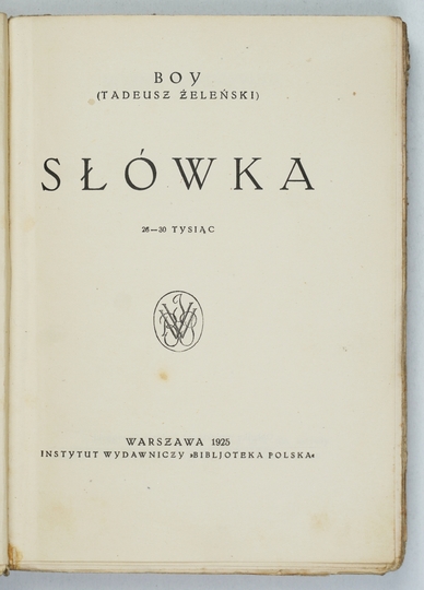 BOY-ŻELEŃSKI Tadeusz – Słówka. Warszawa 1925. Instytut Wyd. "Bibljoteka Polska". 16d, s. [4], 352. brosz.