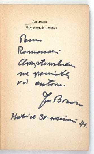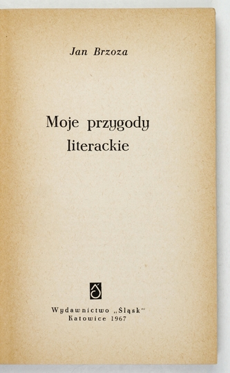 BRZOZA Jan – Moje przygody literackie. Katowice 1967. Wyd. "Śląsk". 16d, s. 221, [3]. brosz., obw.