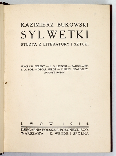 BUKOWSKI Kazimierz – Sylwetki. Studya z literatury i sztuki: Wacław Berent, L. S. Liciński, Baudelaire, E. A. Poe, Oscar Wilde, Aubrey Beardsley, August Rodin. Lwów 1914. Księg. Polska B. Połonieckiego16d, s. [8], 248. opr. pł. z epoki.