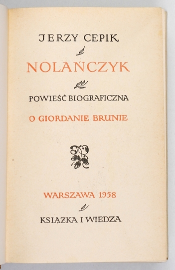 CEPNIK Jerzy – Nolańczyk. Powieść biograficzna o Giordanie Brunie. Warszawa 1958. Książka i Wiedza. 8, s. 633, [2], tabl. 1. opr. oryg. pł., obw.