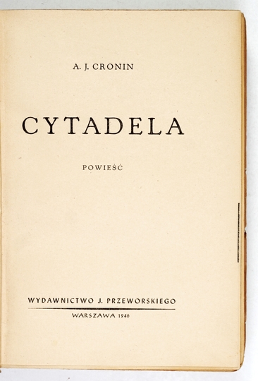 CRONIN A. J. – Cytadela. Powieść. Warszawa 1946. Wydawnictwo J. Przeworskiego. 8, s. 439, [1]. brosz.