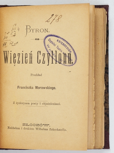 [oraz] BYRON - Więzień Czyllonu. Przekł. Franciszka Morawskiego. Z życiorysem poety i objaśnieniami. Złoczów [1893]. Nakł. i Drukiem Wilhelma Zukerkandla. 16, s.31.