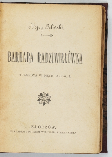 FELIŃSKI Aloizy – Barbara Radziwiłłówna. Tragedya w 5 aktach. Złoczów [1903]. Nakł. i Drukiem Wilhelma Zukerkandla. 16, s. 78, [4];