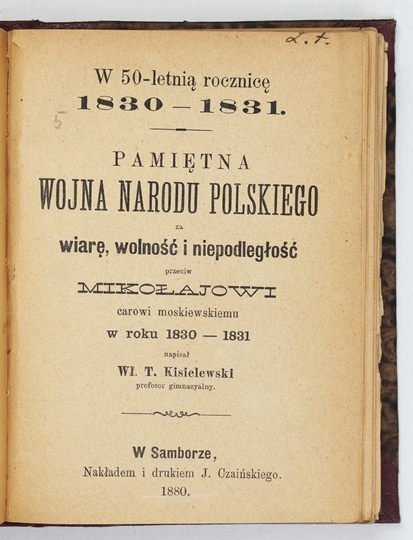 [oraz] KISIELEWSKI Wł. T. - Pamiętna wojna narodu polskiego za wiarę, wolność i niepodległość przeciw Mikołajowi carowi moskiewskiemu w roku 1830-1831. Sambor 1880. Nakł. i drukiem J. Czaińskiego. 16, s. 49, [2].