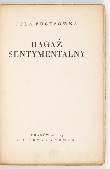 FUCHSÓWNA Jola – Bagaż sentymentalny. Kraków 1934. S. A. Krzyżanowski. 16d, s. 189, [3]. brosz.