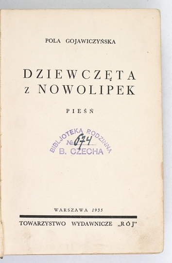 GOJAWICZYŃSKA Pola – Dziewczęta z Nowolipek. Pieśń. T. 1-2. Warszawa 1935. Towarzystwo Wydawnicze "Rój". 16d, s. 241, [3]; 233, [7]. razem opr. oryg. pł.