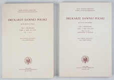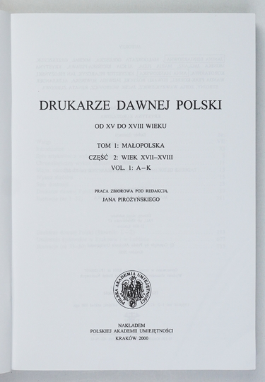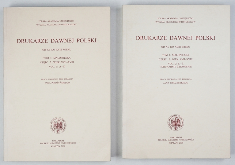 DRUKARZE dawnej Polski od XV do XVIII wieku. T. 1: Małopolska, cz. 2, wol. 1-2. Praca zbiorowa pod red. Jana Pirożyńskiego. Kraków 2000. Nakł. PAU. 8, s. XIV, 379, tablice; XI, [1], [383]-732, tablice. brosz.