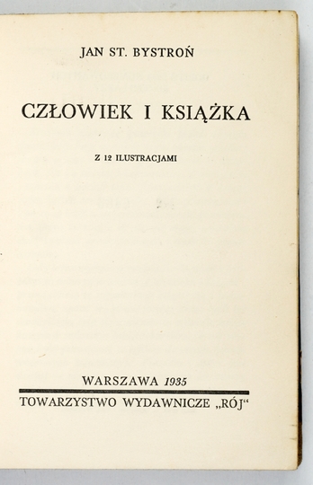 BYSTROŃ Jan St[anisław] – Człowiek i książka. Z 12 ilustracjami. Warszawa 1935. Tow. Wyd. "Rój". 16d, s. 200, [8], tabl. 12. opr. bibliot. ppł.