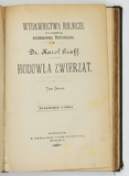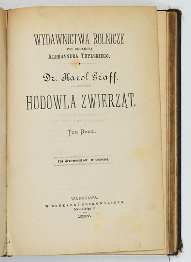 GRAFF Karol – Hodowla zwierząt. T. 1-2 (w 1 wol.). Warszawa 1886-1887. W Drukarni Noskowskiego. 8, s. IV, 480, III, [1]; II, 313. razem opr. psk. z epoki. Wydawnictwa Rolnicze pod redakcyą Aleksandra Trylskiego.