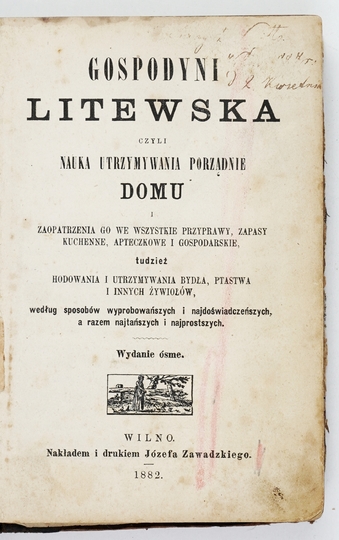 [CIUNDZIEWICKA Anna] – Gospodyni litewska czyli nauka utrzymywania porządnie domu i zaopatrzenia go we wszystkie przyprawy, zapasy kuchenne, apteczkowe i gospodarskie; tudzież hodowania i utrzymywania bydła, ptastwa i innych żywiołów, według sposobów wyprobowańszych i najdoświadczeńszych, a razem najtańszych i najprostszych. Wyd. VIII. Wilno 1882. J. Zawadzki. 8, s. 520. opr. psk. z epoki.