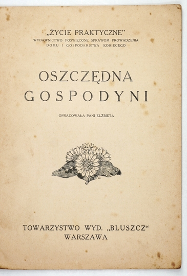 [KIEWNARSKA Elżbieta] – Oszczędna gospodyni. Oprac. Pani Elżbieta [krypt.]. Warszawa [1927]. Towarzystwo Wyd. "Bluszcz. 8, s. 35, [1]. brosz.