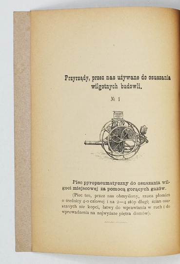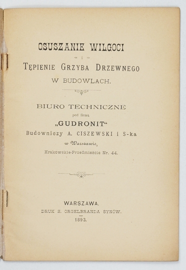 OSUSZANIE wilgoci i tępienie grzyba drzewnego w budowlach. Biuro Techniczne pod firmą "Gudronit", budowniczy A. Ciszewski i S-ka w Warszawie, Krakowskie-Przedmieście Nr. 44. Warszawa 1893. Druk. S. Orgelbranda Synów. 16d, s. [2], 30. brosz.