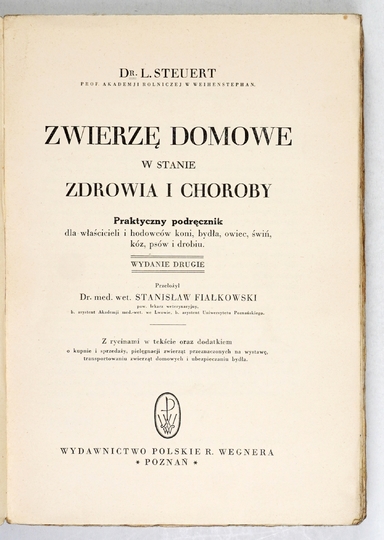 STEUERT L[udwig] – Zwierzę domowe w stanie zdrowia i choroby. Praktyczny podręcznik dla właścicieli i hodowców koni, bydła, owiec, świń, kóz, psów i drobiu. Wyd. II. Przeł. Stanisław Fiałkowski. Z rycinami w tekście oraz dodatkiem o kupnie i sprzedaży, pielęgnacji zwierząt przeznaczonych na wystawę, transportowaniu zwierząt domowych i ubezpieczeniu bydła. Poznań [nie przed 1930]. Wyd. R. Wegnera. 4, s. XV, [1], 464. brosz. wt. [?].
