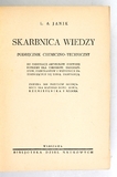 JANIK L. A. – Skarbnica wiedzy. Podręcznik chemiczno-techniczny do fabrykacji artykułów pierwszej potrzeby dla chemików, drogerzystów, fabrykantów i wszystkich interesujących się tanią fabrykacją. Zawiera 3000 przepisów niezbędnych dla każdego domu, kupca, rzemieślnika i rolnika. Warszawa [1938]. Bibl. Dzieł Naukowych. 8, s. 646, [1]. opr. oryg. pł.