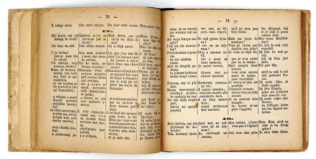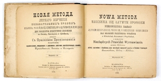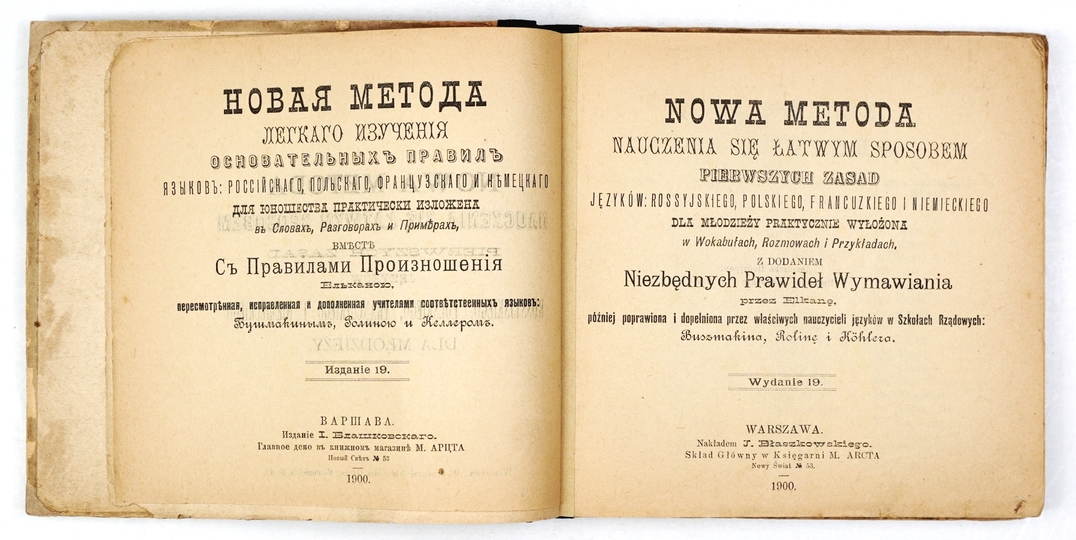 ELKANA J. M. – Nowa metoda nauczenia się łatwym sposobem pierwszych zasad języków: rossyjskiego, polskiego, francuzkiego i niemieckiego. Dla młodzieży praktycznie wyłożonaw Wokabułach, Rozmowach i Przykładach z dodaniem Niezbędnych prawideł wymawiania przez ...przez Elkanę, później poprawiona i dopełniona przez właściwych nauczycieli w Szkołach Rządowych: Buszmakina, Rolinę i Köhlera. Wyd. XIX. Warszawa 1900. Nakł. J. Błaszkowskiego. 16d, s. 227, [1]. opr. oryg. ppł.