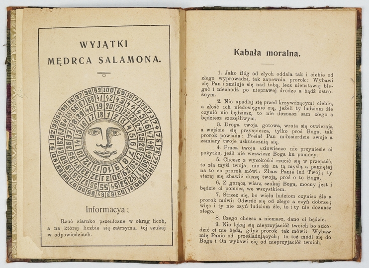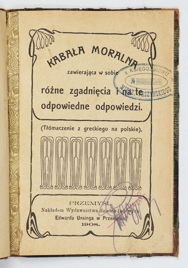 KABAŁA moralna zawierająca w sobie różne zgadnięcia [!] i na te odpowiednie odpowiedzi. (Tłumaczenie z greckiego na polskie). Przemyśl 1908. Nakł. Wydawnictwa dziełek ludowych Edwarda Unsinga. 16d, s. 16. opr. ppł. z epoki.