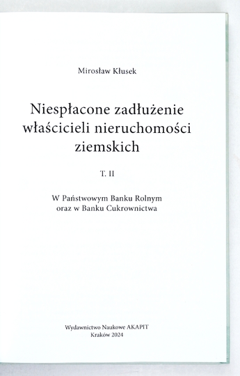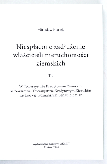 KŁUSEK Mirosław – Niespłacone zadłużenie właścicieli ziemskich. T. 1-2. Kraków 2024. Wydawnictwo Naukowe AKAPIT. 8, s. 309; 224. opr. oryg. kart.