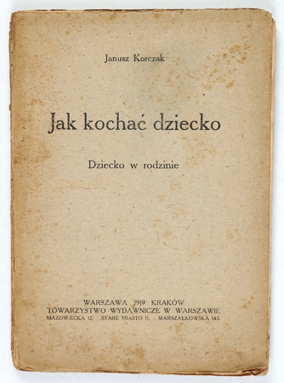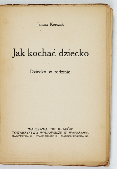 KORCZAK Janusz – Jak kochać dziecko. Dziecko w rodzinie. Warszawa-Kraków 1919. Towarzystwo Wydawnicze. 8, s. [4], 145, [3]. brosz.