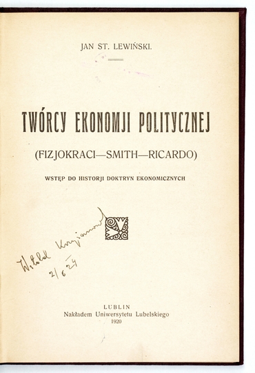 LEWIŃSKI Jan St. – Twórcy ekonomji politycznej (Fizjokraci, Smith, Ricardo). Wstęp do historji doktryn politycznych. Lublin 1920. Nakł. Uniwersytetu Lubelskiego. 8, s. 155, [5]. opr. pł. z epoki. Bibliot. Uniw. Lubelskiego, nr 1.