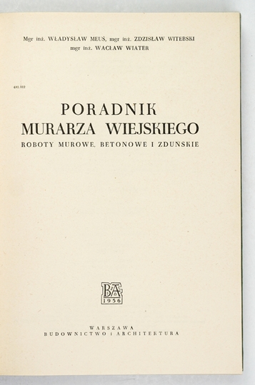 MEUŚ Władysław, WITEBSKI Zdzisław, WIATER Wacław – Poradnik murarza wiejskiego. Roboty murowe, betonowe i zduńskie. Warszawa 1956. Budownictwo i Architektura. 8, s. 485, [2]. opr. oryg. ppł.
