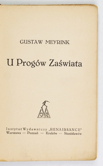 MEYRINK Gustaw – U progów zaświata. Warszawa [ca 1930]. Inst. Wyd. "Renaissance". 16d, s. 104. brosz.