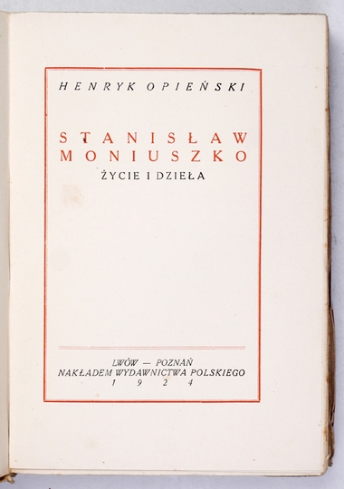 OPIEŃSKI Henryk – Stanisław Moniuszko. Życie i dzieła. Lwów-Poznań 1924. Nakładem Wydawnictwa Polskiego. 8, s. XIII, [3], 446, [1]. brosz.