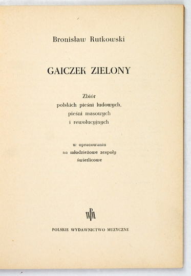 RUTKOWSKI Bronisław – Gaiczek zielony. Zbiór polskich pieśni ludowych, pieśni masowych i rewolucyjnych w oprac. na młodzieżowe zespoły świetlicowe. Kraków 1950. Polskie Wydawnictwo Muzyczne.8, s. 102. brosz.
