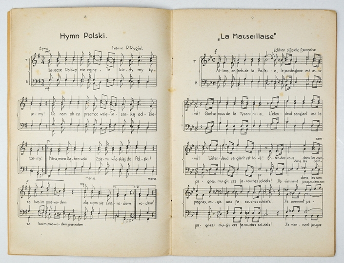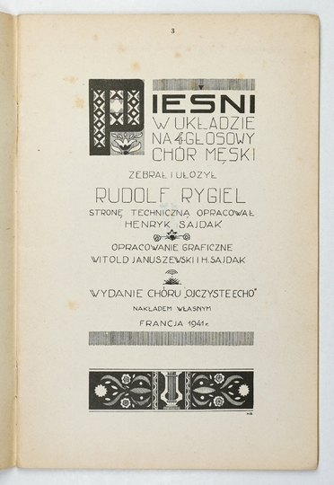 RYGIEL Rudolf – Pieśni w układzie na 4-głosowy chór męski. [Z.] 1. Zebrał i ułożył ... Stronę techniczną opracował Henryk Sajdak. Opracowanie graficzne Witold Januszewski i H. Sajdak. Wydanie Chóru Ojczyste Echo". Francja 1941. Nakładem własnym. 8, s. 32. brosz.