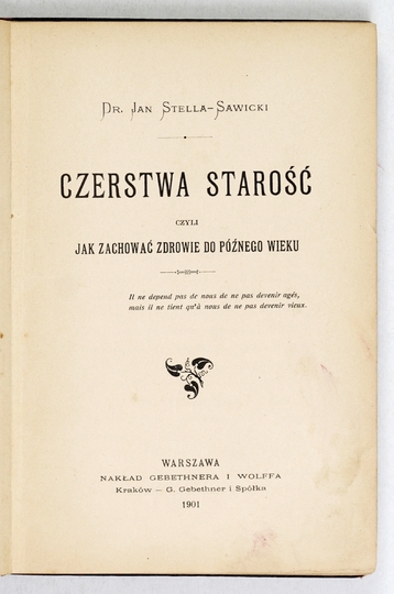 STELLA-SAWICKI Jan – Czerstwa starość czyli jak zachować zdrowie do późnego wieku. Warszawa 1901. Gebethner i Wolff. 16d, s. [2], 163, [2]. opr. oryg. pł. zdob.