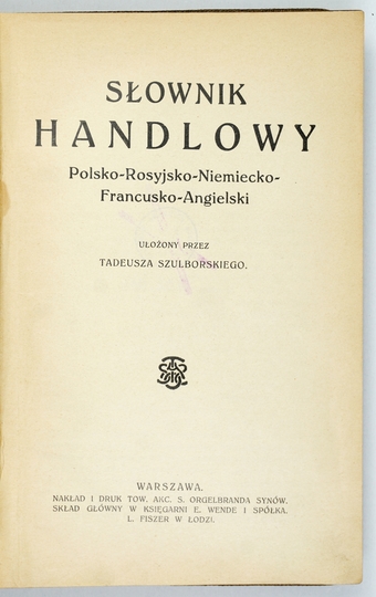 SZULBORSKI Tadeusz – Słownik handlowy polsko-rosyjsko-niemiecko-francusko-angielski. Warszawa [przedm. 1914]. Tow. Akc. S. Orgelbranda Synów. 8, s. [6], 498. opr. pł. z epoki.