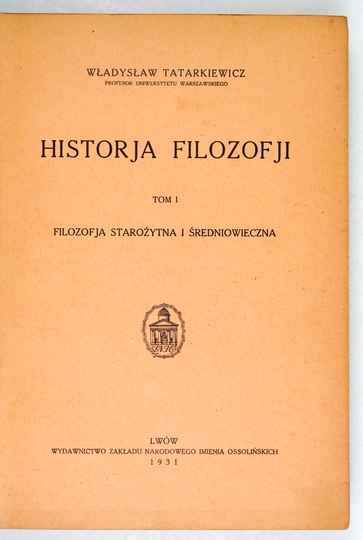 TATARKIEWICZ Władysław – Historja filozofji. T. 1-2. Lwów 1931. Ossolineum. 8, s. [4], 399, tabl. 14; [4], 315, tabl. 28. opr. ppł. z epoki z zach. okł. brosz.