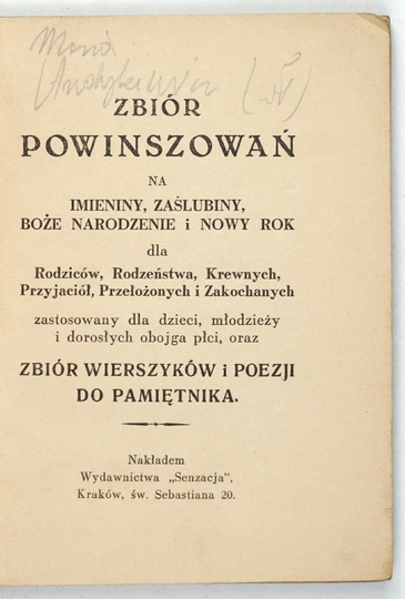 ZBIÓR powinszowań na imieniny, zaślubiny, Boże Narodzenie i Nowy Rok dla rodziców, rodzeństwa, krewnych, przyjaciół, przełożonych i zakochanych zastosowany dla dzieci, młodzieży i dorosłych obojga płci, oraz Zbiór wierszyków i poezyi do pamiętnika. Kraków [1945?]. Wyd. "Senzacya". 16, s. 126, [1]. brosz.