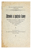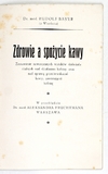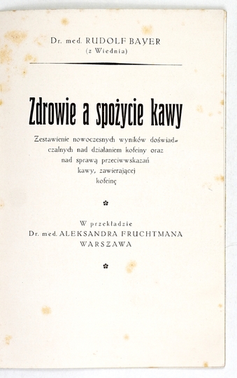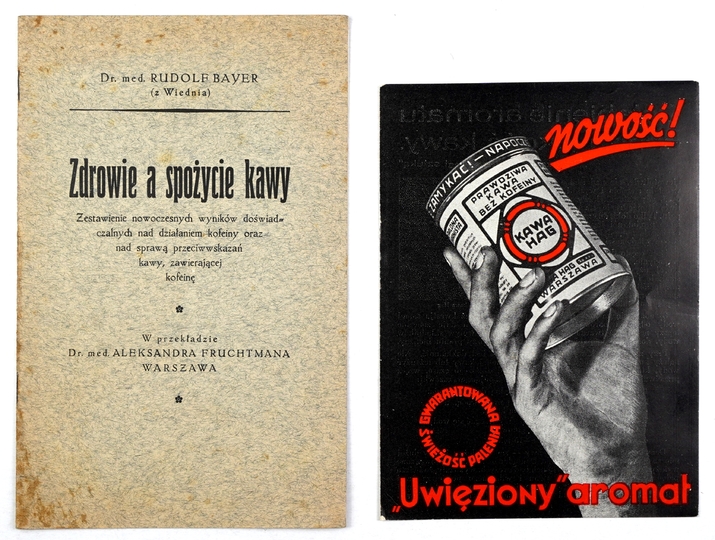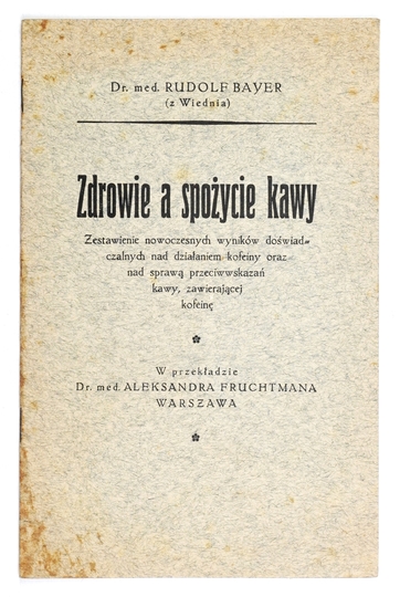 BAYER Rudolf – Zdrowie a spożycie kawy. Zestawienie nowoczesnych wyników doświadczalnych nad działaniem kofeiny oraz nad sprawą przeciwwskazań kawy, zawierającej kofeinę. W przekładzie Aleksandra Fruchtmana. Warszawa [ca 1913]. 8, s. 16. brosz. + Folder w formie leporello (16d, s. [6]) reklamujący "Nowość! Prawdziwa kawa bez kofeiny. Kawa Hag. Warszawa. "Uwięziony aromat. Gwarantowana świeżość palenia".