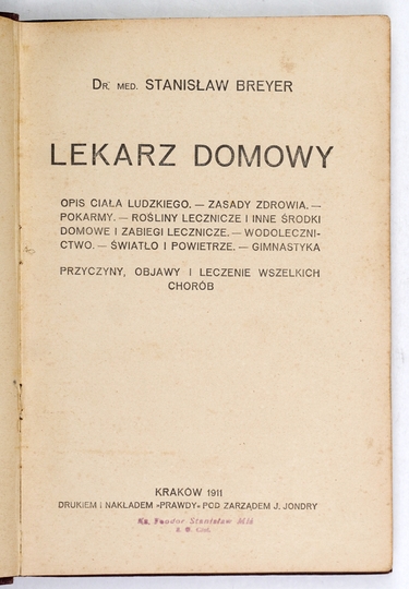 BREYER Stanisław – Lekarz domowy. Opis ciała ludzkiego, zasady zdrowia, pokarmy, rośliny lecznicze i inne środki domowe i zabiegi lecznicze, wodolecznictwo, światło i powietrze, gimnastyka. Przyczyny, objawy i leczenia wszelkich chorób. Kraków 1911. Prawda. 8, s. 214, V, [5]. opr. oryg. pł. zdob.