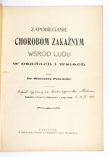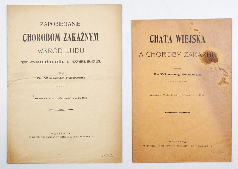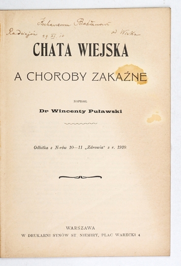 PUŁAWSKI Wincenty – Chata wiejska a choroby zakaźne. Warszawa 1910. W Druk. Synów St. Niemiry. 8, s. 22. brosz. Odbitka z numerów "Zdrowia".
