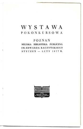 EXLIBRIS dla bibliotek miasta Poznania i województwa poznańskiego. Wystawa pokonkursowa. Poznań, I-II 1977. 8, s. [16]. brosz., obw.