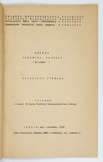 JÓŹWIK Zbigniew – Rzeźba, ceramika, grafika (ex libris) ... Wystawa z okacji 25-lecia Polskiej Rzeczypospolitej Ludowej. Lublin, V-VI 1969. Bibliot. Główna UMCS. 8, k. [9], 3, [1]. brosz.