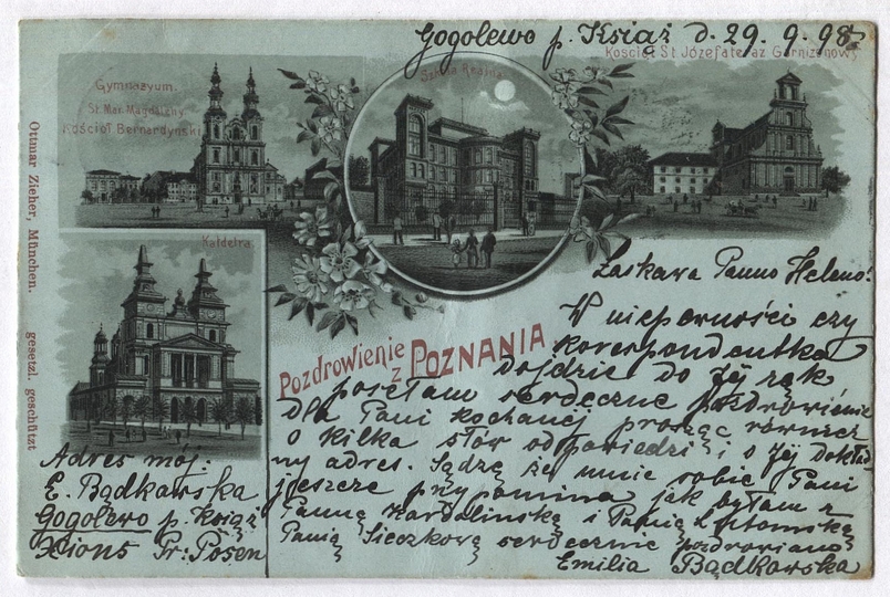 [POZNAŃ]. Pozdrowienie z Poznania. Gymnazyum St. Mar. Magdaleny, Kośiół Bernardynów; Katedra; Szkoła Realne; Kościół St. Józefa teraz Garnizonowy.