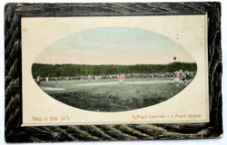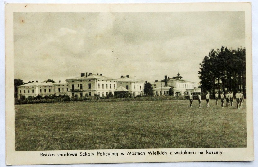 [MOSTY WIELKIE]. Boisko sportowe Szkoły Policyjnej w Mostach Wielkich z widokiem na koszary.