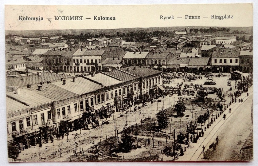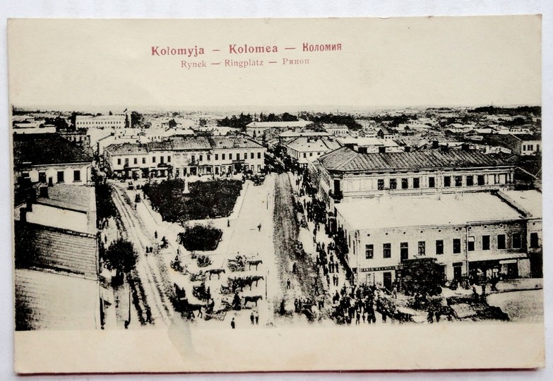 [KOŁOMYJA]. Kołomyja - Kolomea - Kolomija [cyrylicą]. Rynek - Ringplatz - Rynok [cyrylicą].
