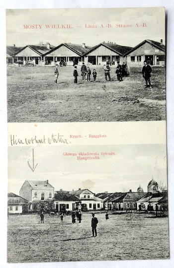 [MOSTY WIELKIE]. Mosty Wielkie. - Linia A.-B. Strasse A.-B. / Rynek. - Ringplatz. / Głowna składownia tytoniu. Haupttrafik.