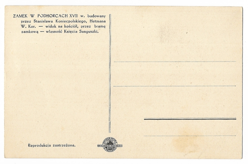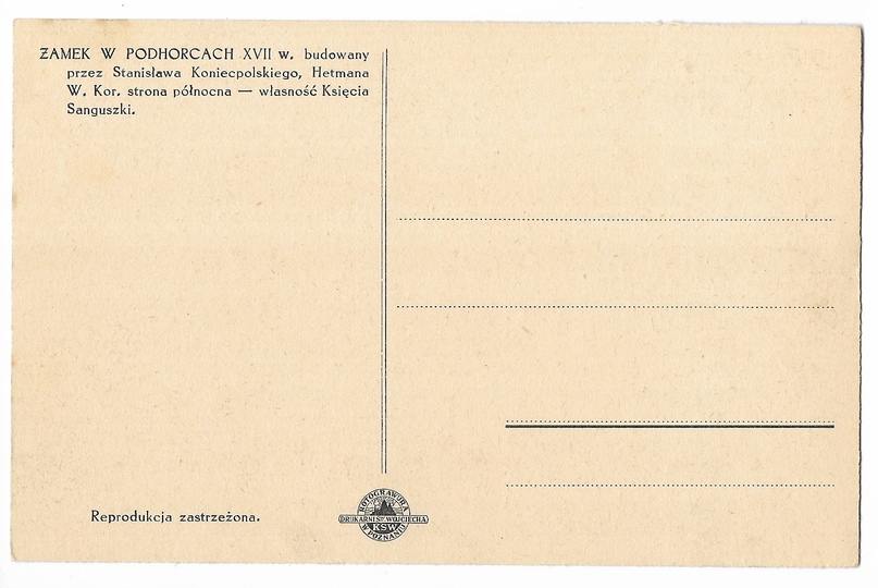 [PODHORCE]. Zamek w Podhorcach XVII w. budowany przez Stanisława Koniecpolskiego [...] strona północna - własność Księcia Sanguszki.