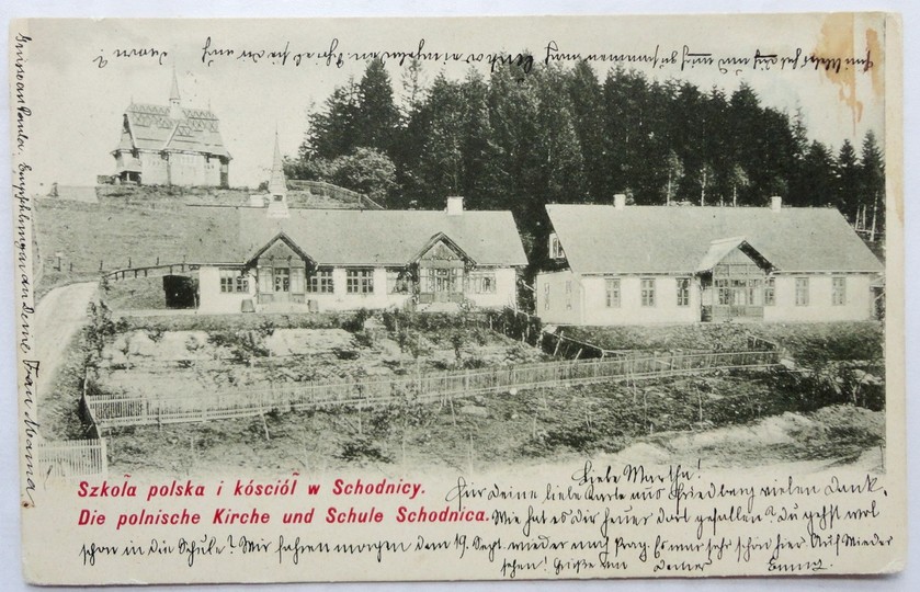 [SCHODNICA]. Szkoła polska i kościół w Schodnicy. Die polnische Kirche und Schule Schodnica.