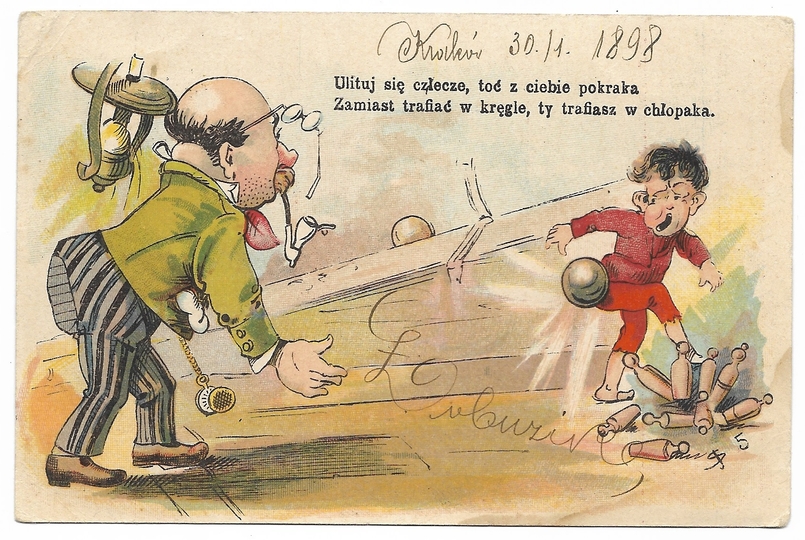 [KRĘGLE]. Ulituj się człecze, toć z ciebie pokraka / Zamiast trafiać w kręgle, ty trafiasz w chłopaka.