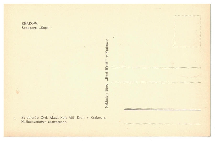 [KRAKÓW]. Synagoga "Kupa". Ze zbiorów Żyd. Akad. Koła Mił. Kraj. w Krakowie.