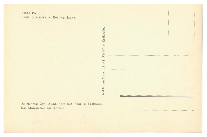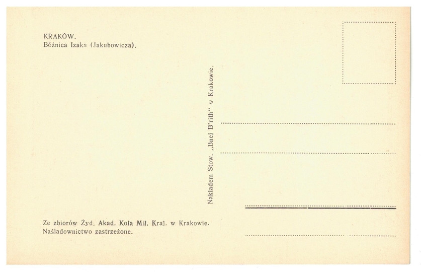 [KRAKÓW]. Bóżnica Izaka (Jakubowicza). Ze zbiorów Żyd. Akad. Koła Mił. Kraj. w Krakowie.