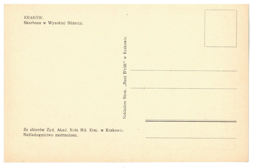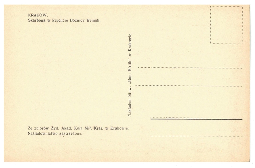 [KRAKÓW]. Skarbona w Wysokiej Bóżnicy. Ze zbiorów Żyd. Akad. Koła Mił. Kraj. w Krakowie.