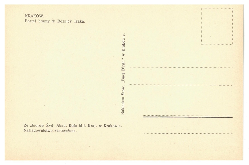 [KRAKÓW]. Portal bramy w Bóżnicy Izaka. Ze zbiorów Żyd. Akad. Koła Mił. Kraj. w Krakowie.