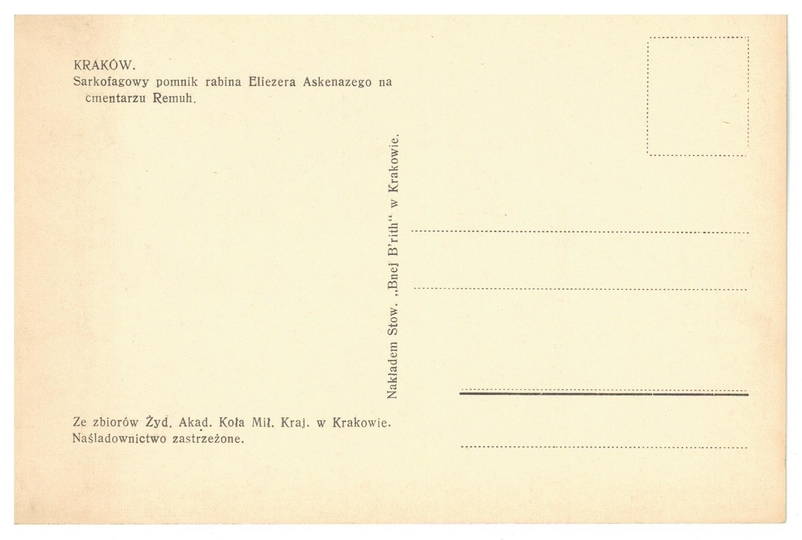 [KRAKÓW]. Sarkofagowy pomnik rabina Eliezera Askenazego na cmentarzu Remuh. Ze zbiorów Żyd. Akad. Koła Mił. Kraj. w Krakowie.