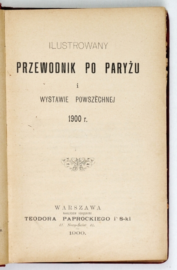 [PRZEWODNIK po Paryżu]. Ilustrowany przewodnik po Paryżu i Wystawie Powszechnej 1900 r. Warszawa 1900. Księg. T. Paprockiego. 16d,s . [4], II, [7]-269, [1], X. opr. oryg. pł.